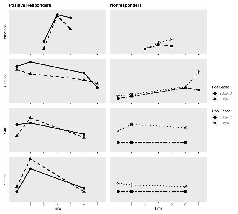 Visual comparison of changes in elevation, cortisol, guilt, and shame with four subjects across seven timepoints during the experimental session. The y-axis scale differs for each measure; therefore, this figure primarily represents corresponding decreases and/or increases for measures across time as participants progress through experimental tasks.